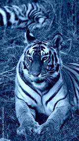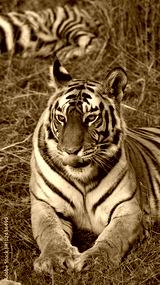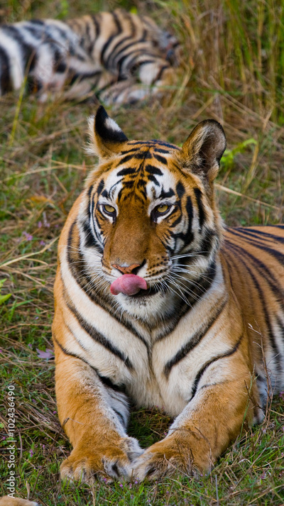 Wild tiger lying on the grass. India. Bandhavgarh National Park. Madhya Pradesh. An excellent illustration.