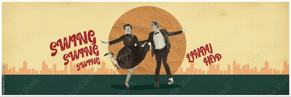 Lindy Hop dance with elegant man and woman in stylish costumes performing on light yellow background with city skyline. 1950s swing culture. Concept of retro aesthetic, vintage dance, nostalgia