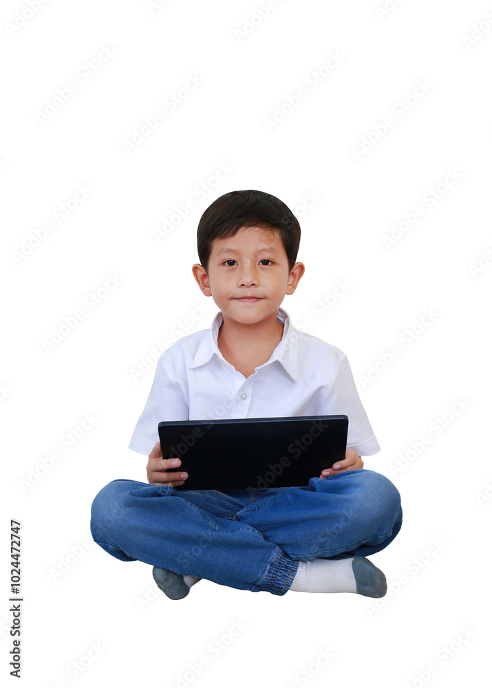 Portrait Asian little boy child playing tablet computer while sitting isolated on white background. Full body photo with clipping path.