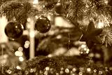 Christmas and New Years background with fir tree and red decoration.