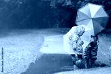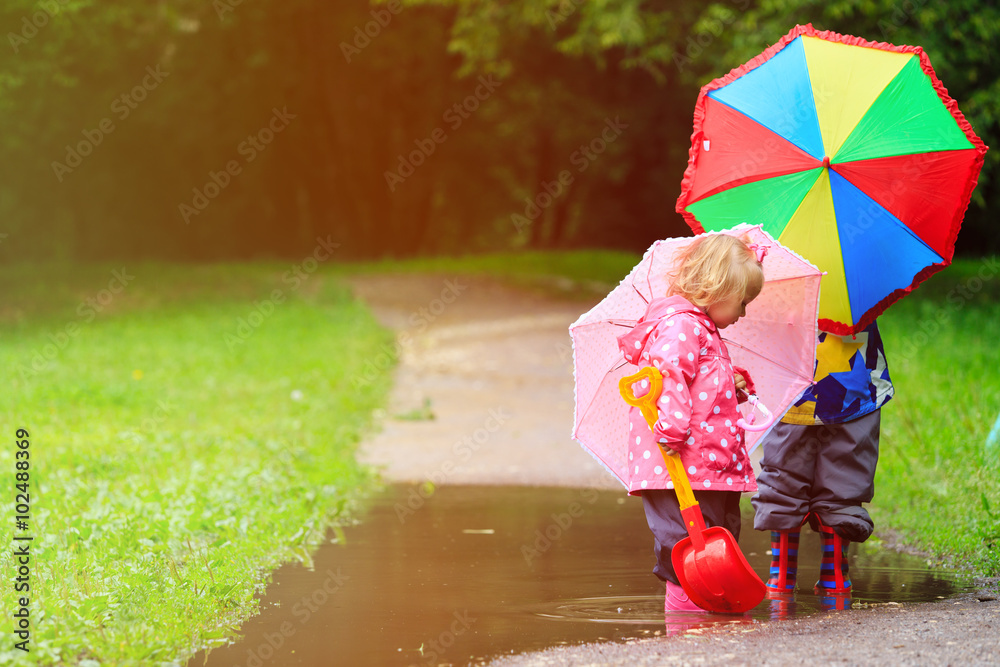 little boy and girl with umbrellas playing in water puddle