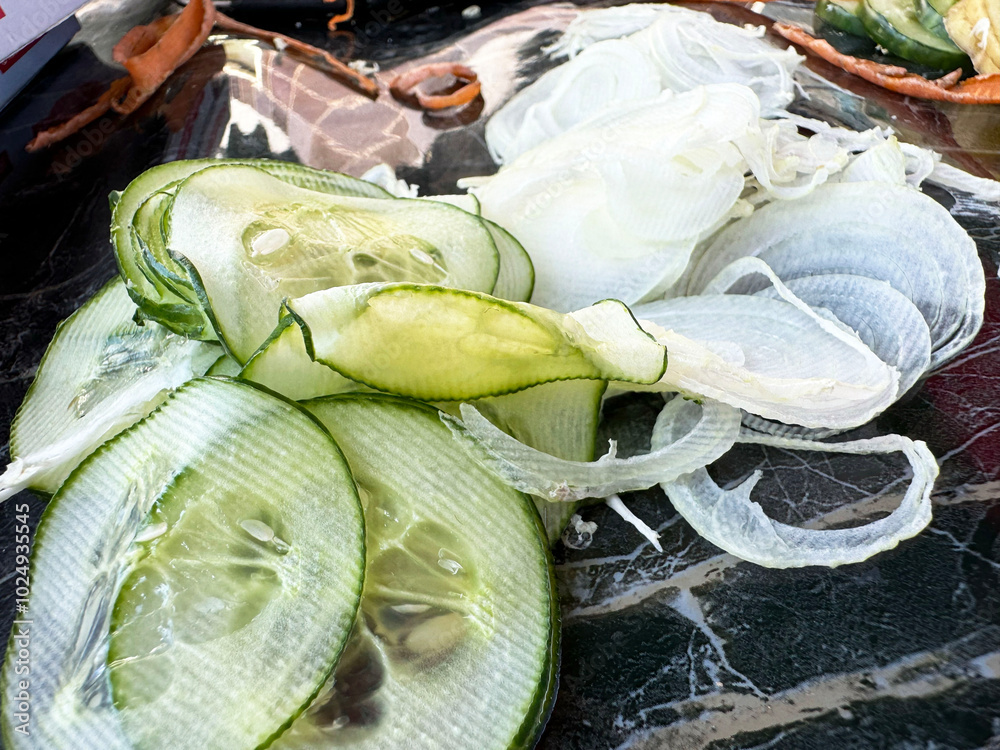Sliced cucumbers and onions on marble surface - fresh, crisp, perfect for salads
