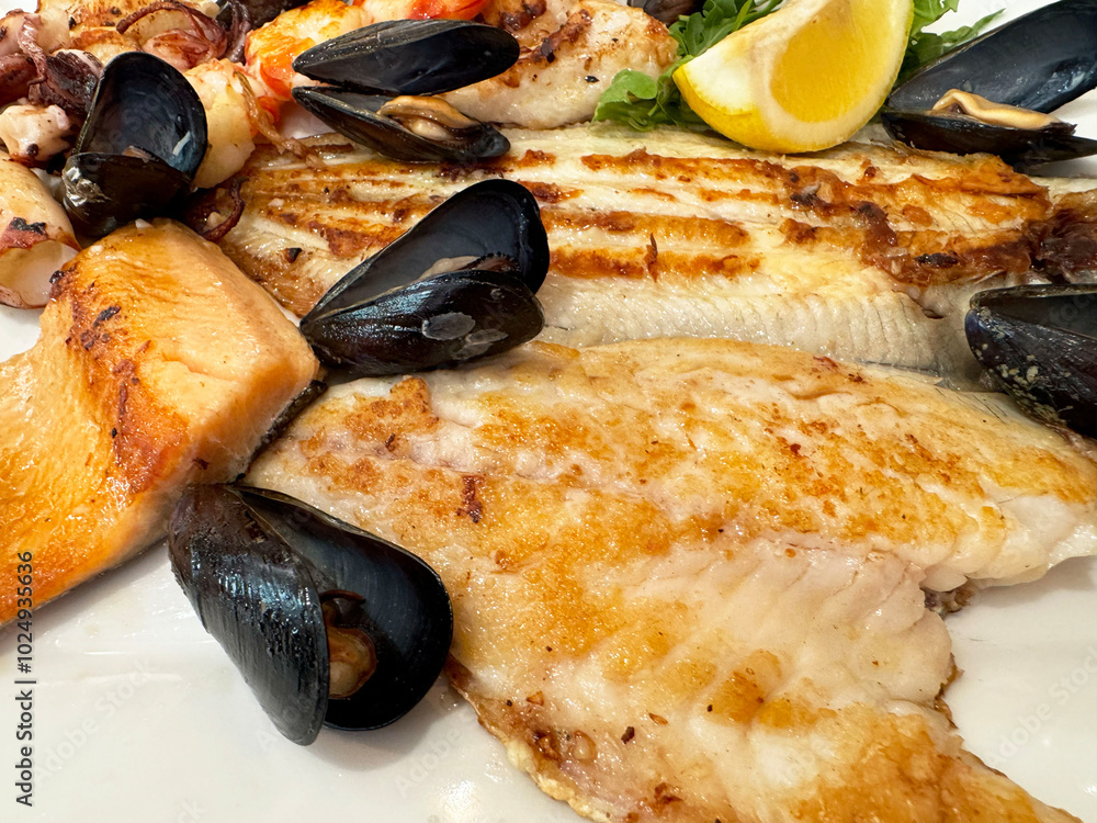 Grilled seafood platter with fish, mussels, and lemon garnish – delicious mediterranean cuisine