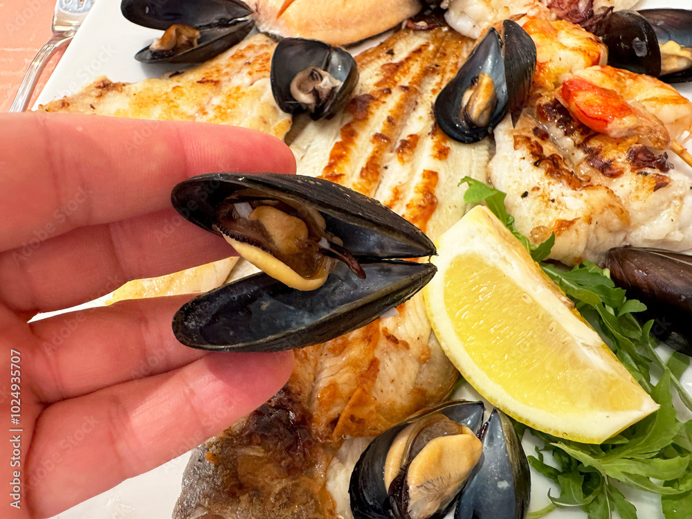Grilled seafood platter with mussels, lemon, and fresh herbs on a white plate