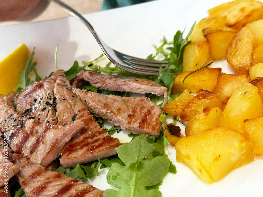 Juicy grilled beef steak and golden potatoes on arugula with lemon wedge