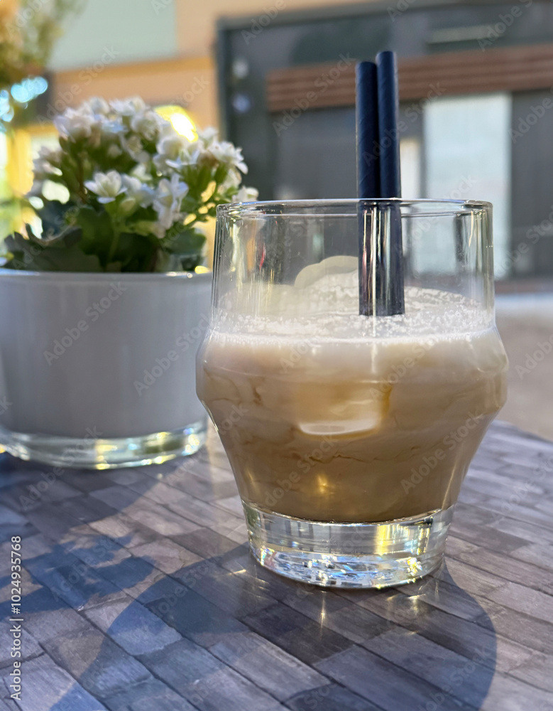Iced coffee with black straws on textured table next to flower pot outdoors