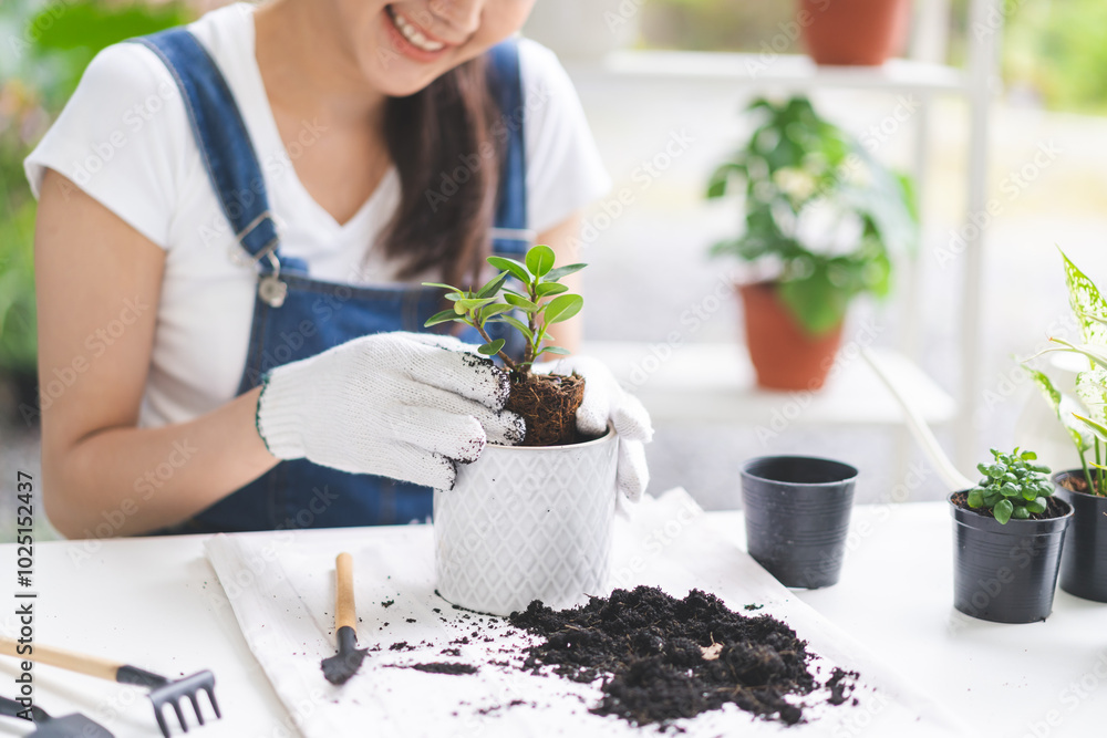 Spring hobby, asian young woman, girl hand transplanting in ceramic flower pot, houseplant with dirt or soil on table at home, gardening tree plant in garden farm, green tropical, beauty and nature.