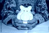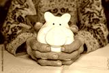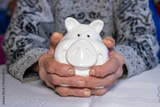 A retired woman is holding a piggy bank. Financial concept. The economic situation of older people, life in old age