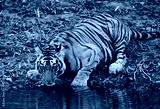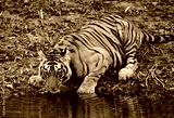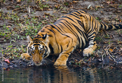 Wild Bengal Tiger drinking water from a pond in the jungle. India. Bandhavgarh National Park. Madhya Pradesh. An excellent illustration.