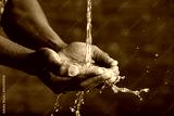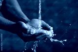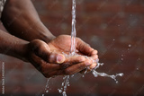 Hands washing concept. Water pouring into man hands on brick wall background