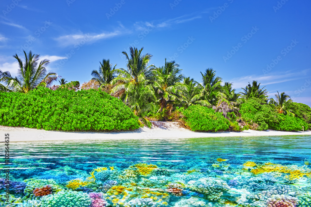 Tropical island and the underwater world in the Maldives. Thoddo