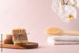 Natural skincare products with a bamboo back brush, handmade soap bars, and a towel