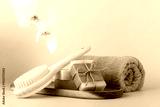Natural skincare products with a bamboo back brush, handmade soap bars, and a towel