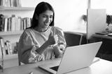 Cheerful young Indian student with hearing disability talking on video call at laptop in library, showing like, thumb up gesture on palm at computer, using sign language for Internet communication
