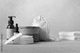 Natural skincare products featuring wooden containers, reusable cotton pads, eco-friendly packaging, and spa essentials
