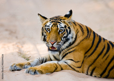 Wild Bengal Tiger lying on the road in the jungle. India. Bandhavgarh National Park. Madhya Pradesh. An excellent illustration.