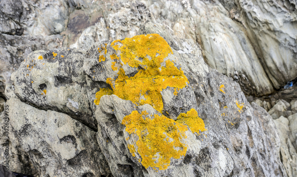 A close-up of a rugged rock formation covered with bright yellow lichen, symbolizing resilience and nature's ability to thrive in harsh environments.