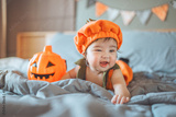 Happy cute asian newborn baby girl dressed in Halloween jack o lantern costume during tummy time on bed with Halloween decoration, having fun and celebrating Halloween at home