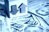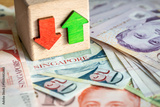 Singapore money lying on the table, block with arrows of growth and decline, Financial business concept. Market analysis and value of Singapore dollar. close up