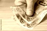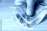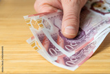 UK money. 50 pound notes laid on counter. Financial economic concept, close up
