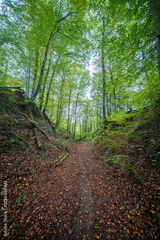 A lush forest pathway surrounded by vibrant greenery in every direction imaginable