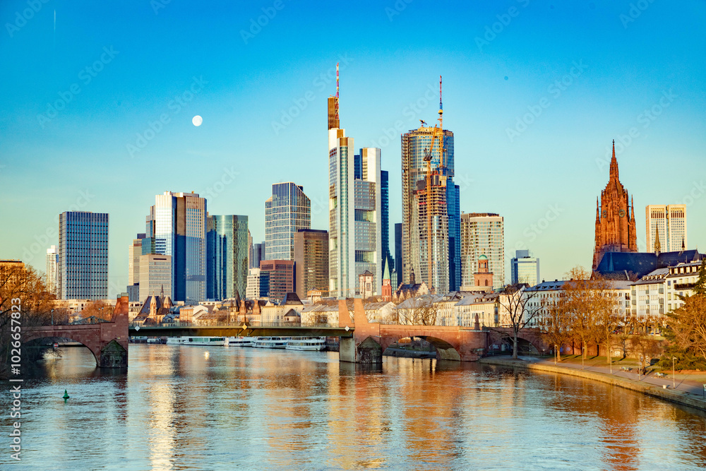 scenic skyline of Frankfurt am Main with reflection in the river, Germany