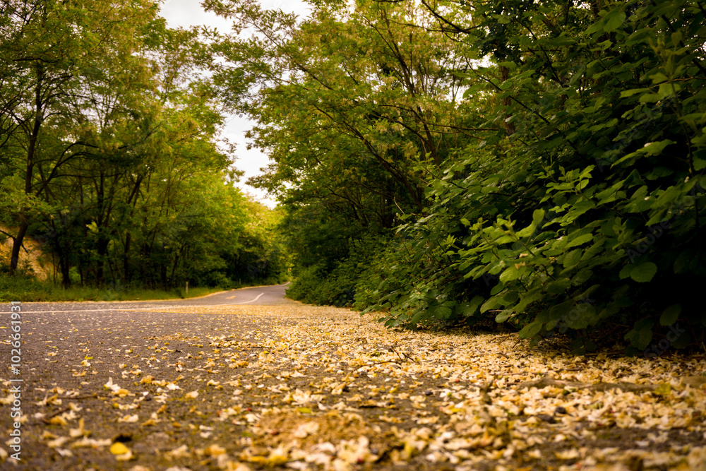 A tranquil road surrounded by lush green forest, with fallen leaves hinting at seasonal change. The low angle emphasizes the peaceful journey ahead.