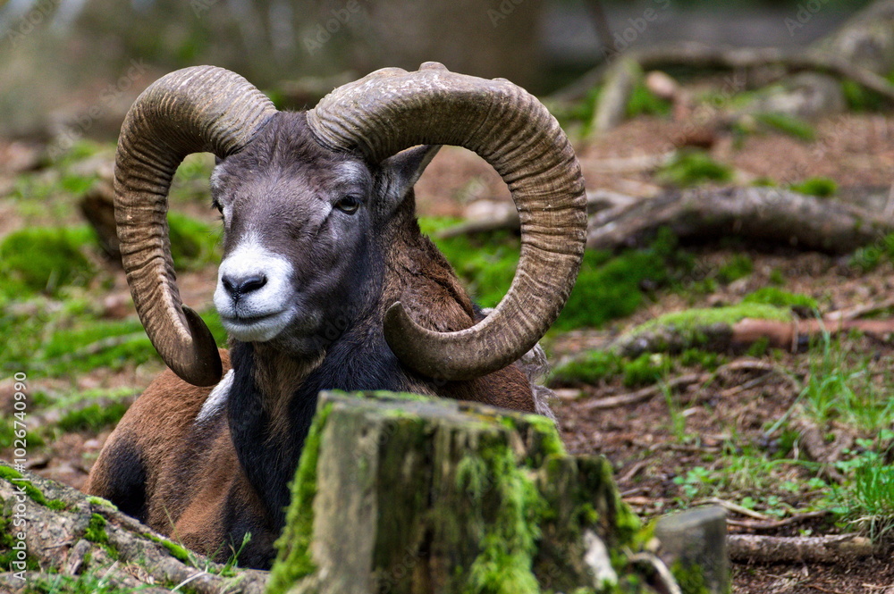 Ovis aries musimon aka The European mouflon male with majestic horns is resting in the forest in autumn evening. Nature of Czech republic.