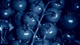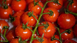 Red cherry tomatoes on a branch, washed with water. Top view.