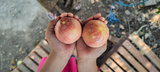 A child's hand carries a reddish purple passion fruit, Nganjuk Indonesia Saturday 12 October 2024