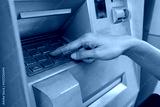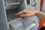 Close up of woman hand entering PIN code into an ATM bank machine.