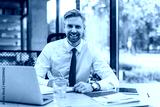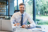 Portrait of happy businessman sitting at office desk, looking at camera, smiling.