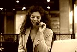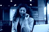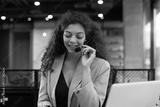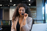 African american positive young woman with headset, sit in modern office, talking with colleagues or having online consultation with clients by video call