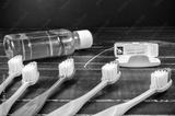 Set of colorful toothbrush with mouthwash and dental floss on wooden board