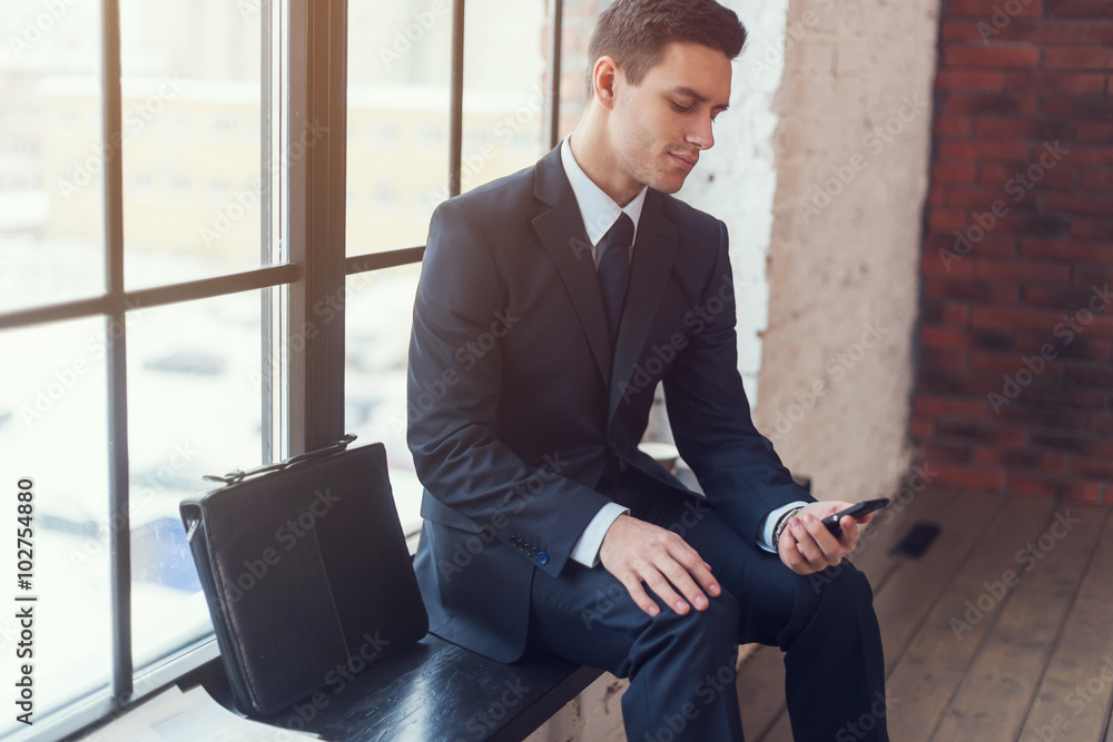 Businessman sitting waiting looking at mobile phone