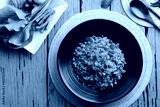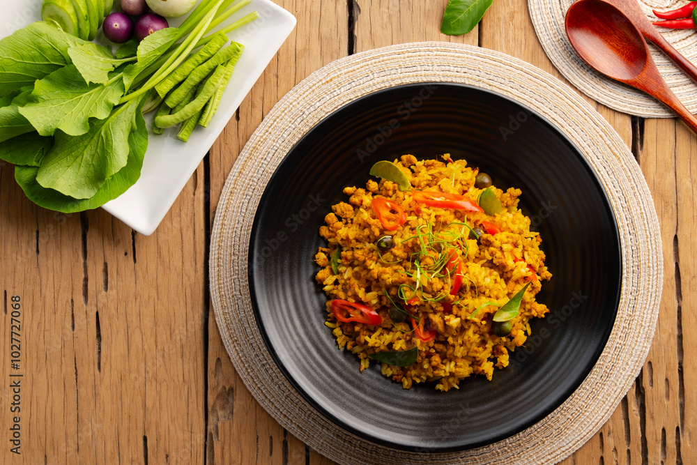Southern Thai Yellow Curry Paste Fried Rice with ground pork in black plate.(khao pad Kuo Kling).Top view.