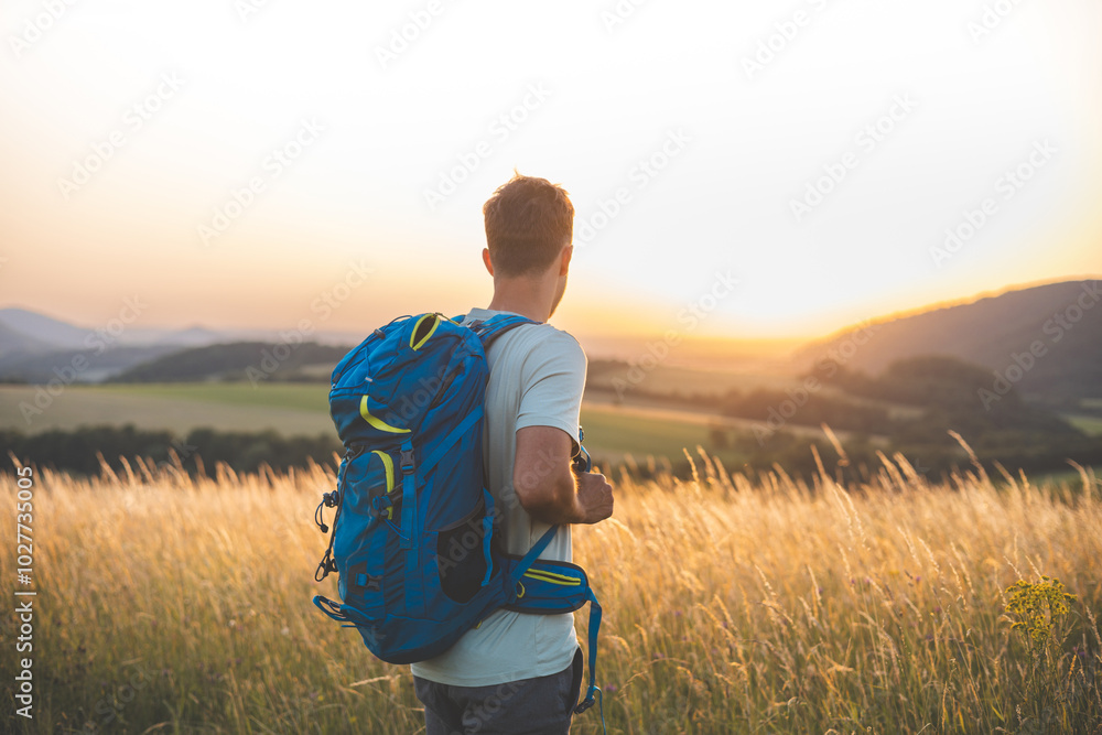 Man with a blue backpack stands in a grassy field, gazing at a breathtaking sunset over rolling hills. The scene captures the tranquility of nature, adventure, and personal reflection as the sun sets