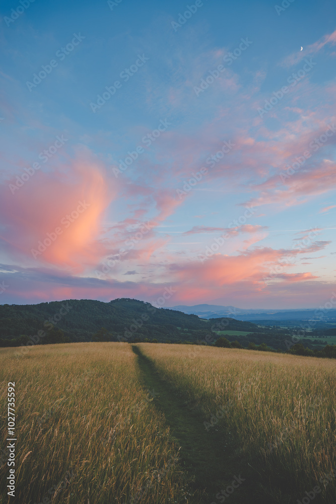 Scenic path cuts through a golden field under a vibrant sunset sky in the Czech Republic. Pink and orange clouds float above lush green hills, creating a tranquil and breathtaking landscape