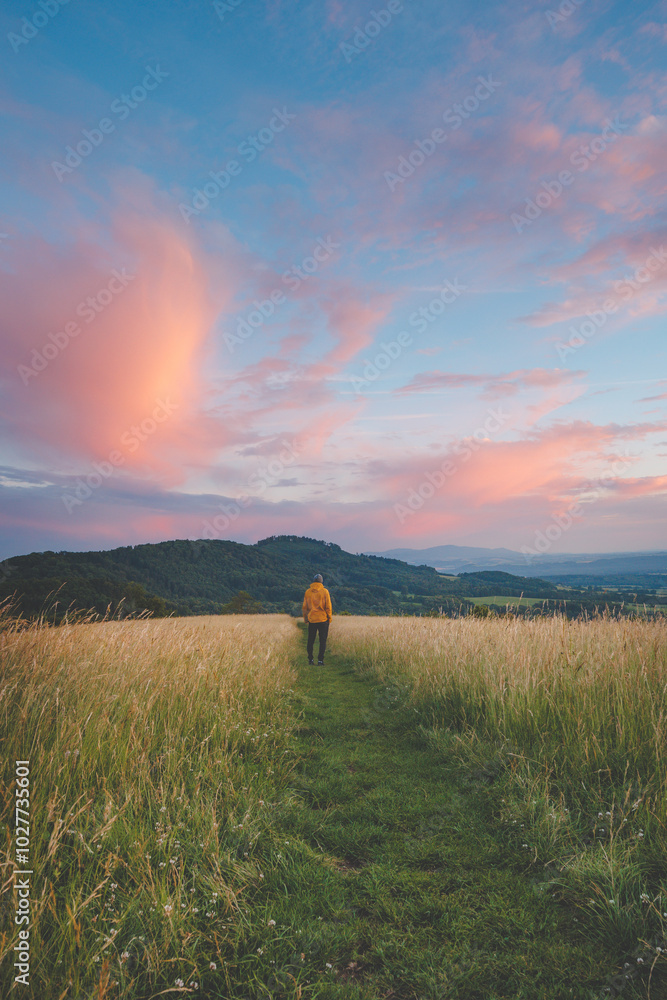 Lone hiker in a yellow jacket walks through a grassy field, surrounded by golden hues under a dramatic pink and blue sunset sky in the Czech Republic. Hills and distant valleys complete the view