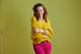 happy fit woman in yellow sweater isolated on green background