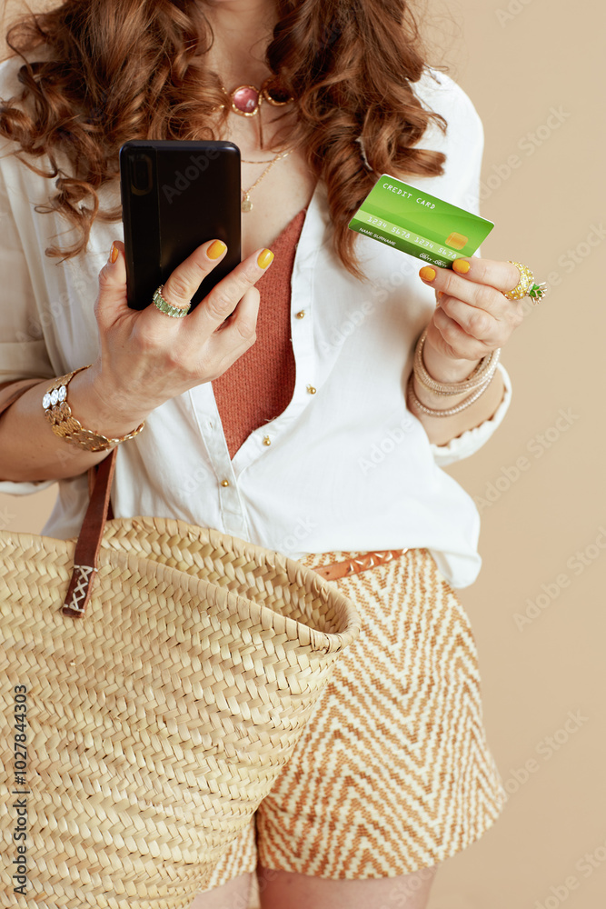 Stylish female in blouse and shorts isolated on beige