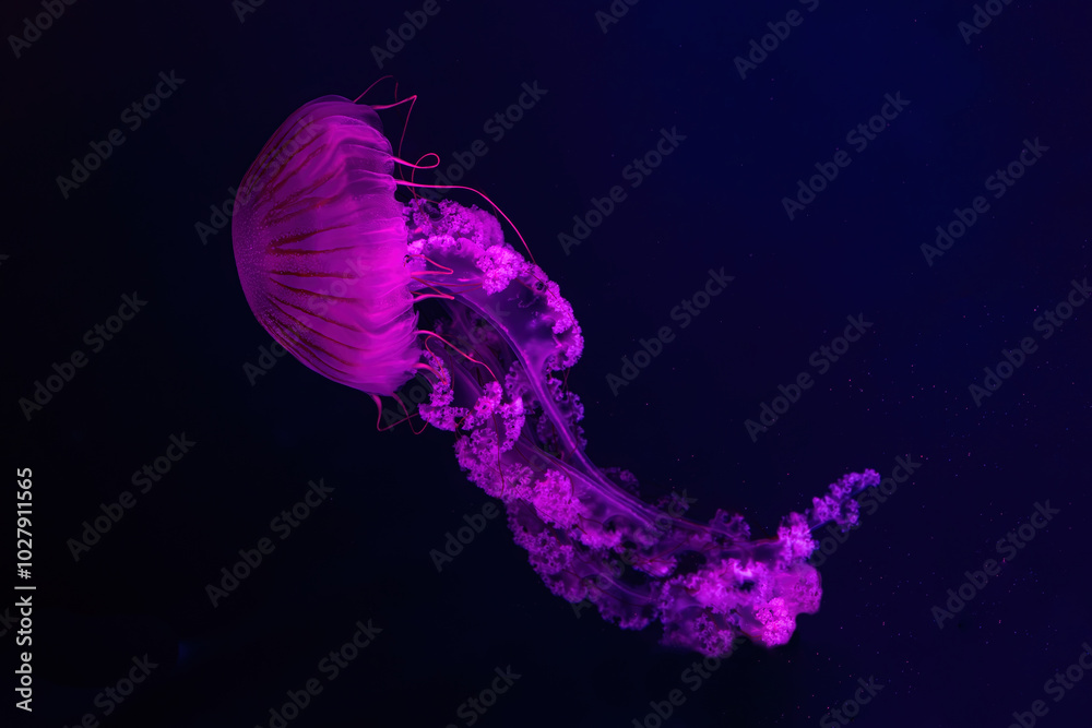 Jellifish South american sea nettle, Chrysaora plocamia swimming in aquarium tank with red neon illumination. Aquatic organism, animal, undersea life, biodiversity