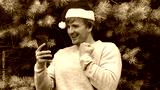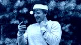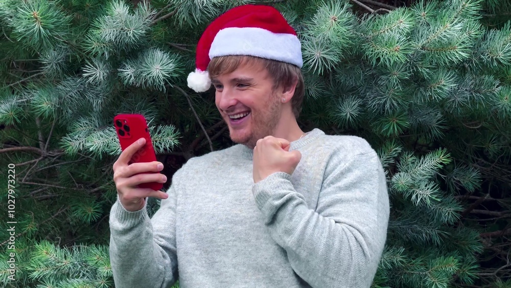 Young happy overjoyed man in Christmas hat looking at his cell mobile phone and having fun