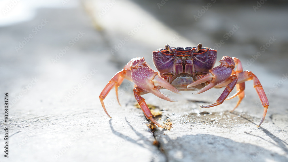 vibrant crab walking on concrete surface, showcasing its unique colors and features