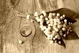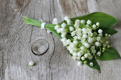 Bouquet of spring flowers Lily of the valley lying on a wooden plank.
