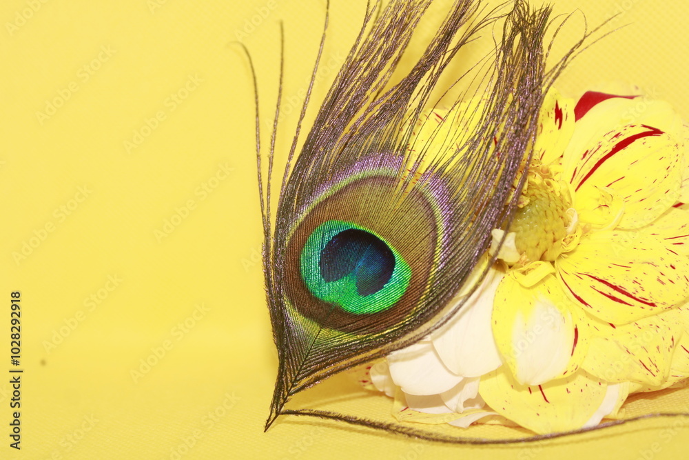 Peacock feather on a yellow background with yellow flower petals, top view, flat lay. Trend bright colors. Blank Space for text.
