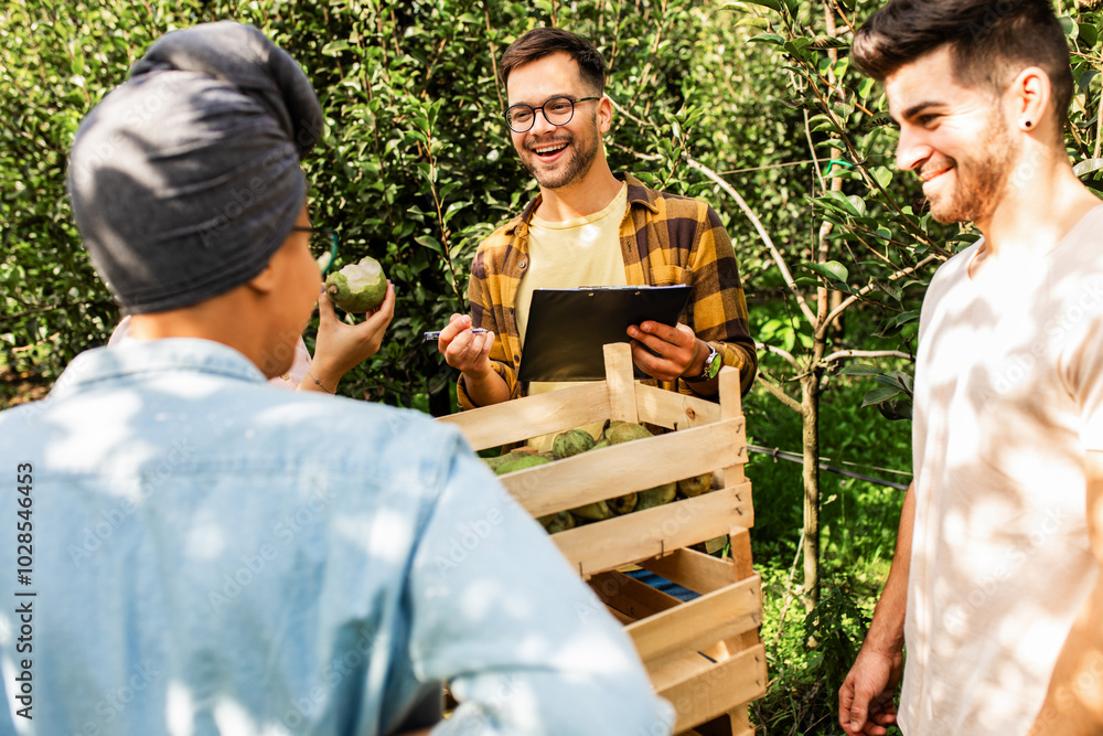 Group of agriculture students examines the fruit yield in a pear orchard.