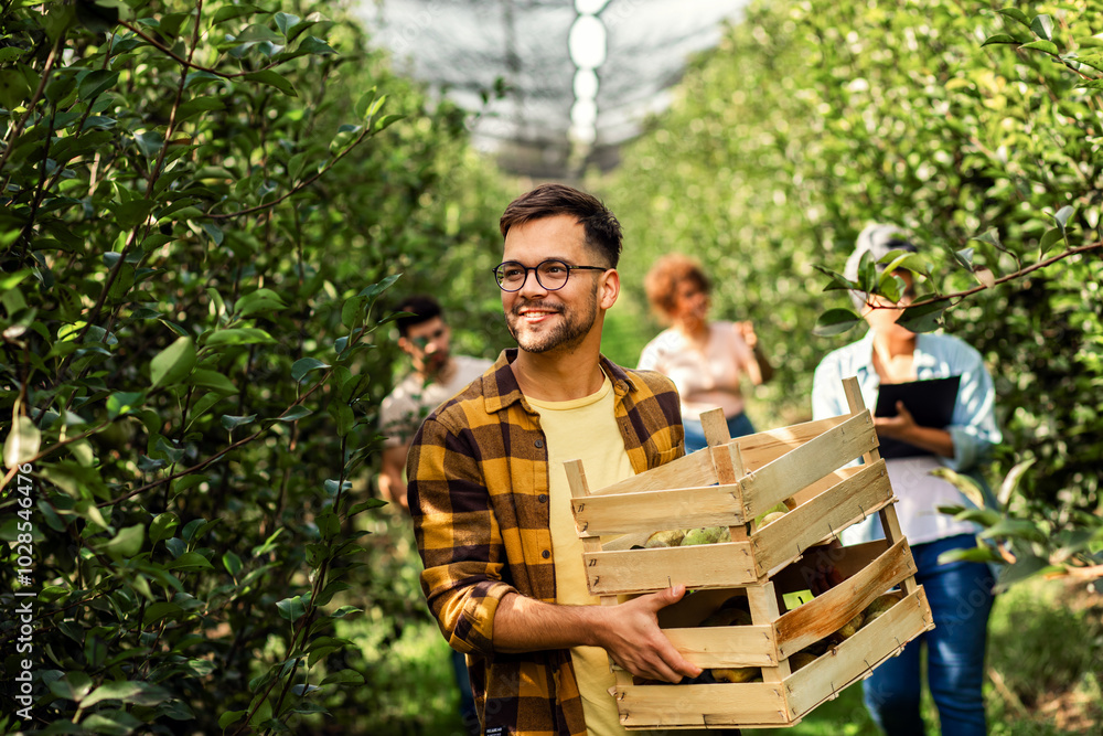 Group of agriculture students examines the fruit yield in a pear orchard.