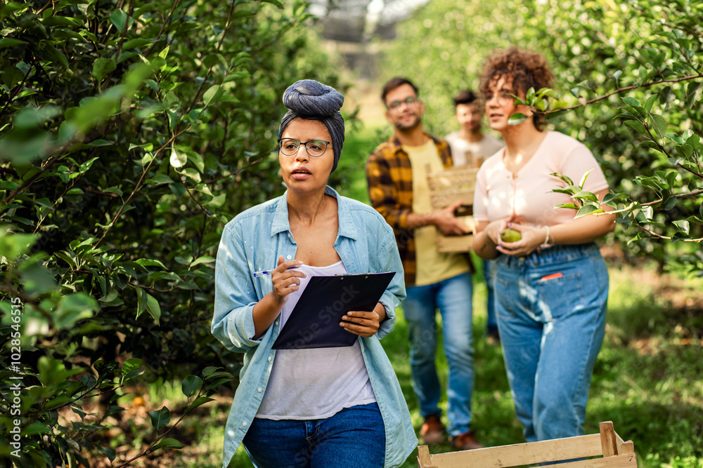 Portrait of African american agriculture students examines the fruit yield in a pear orchard.