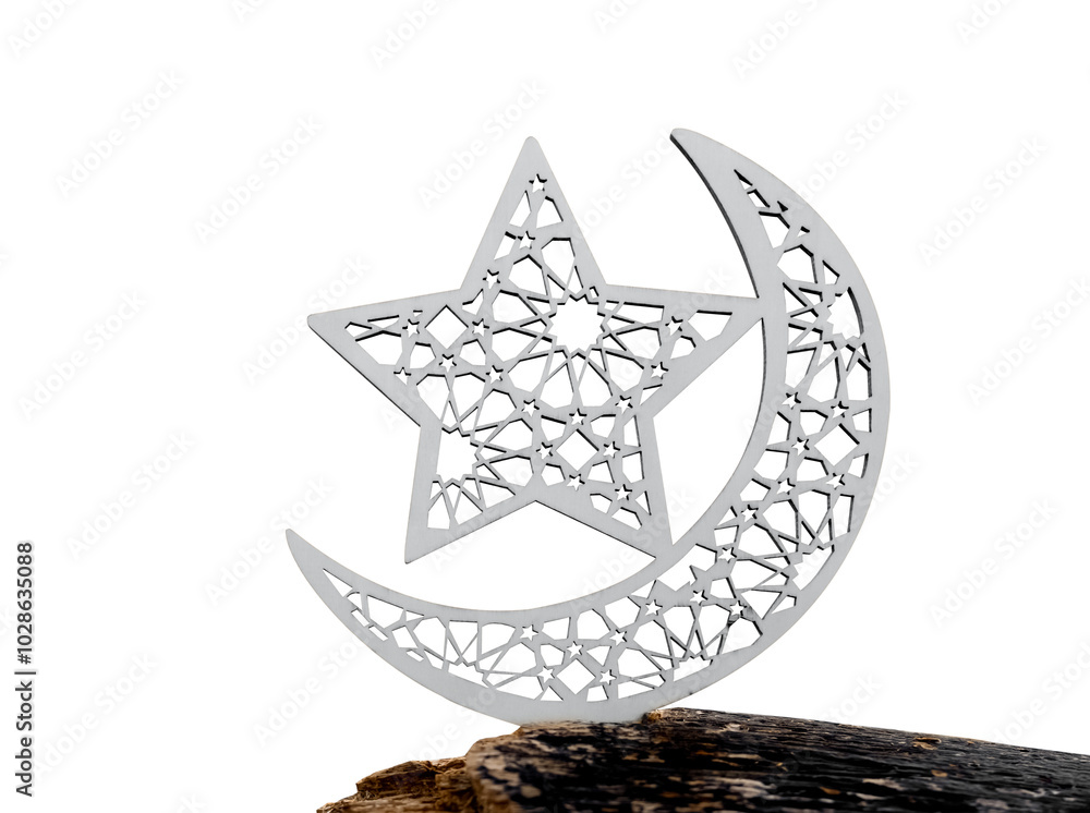 Crescent moon and star shape isolated on white background,White wood with Arab calligrapher or craft for Ramadan Ramadan Mubarak banner design